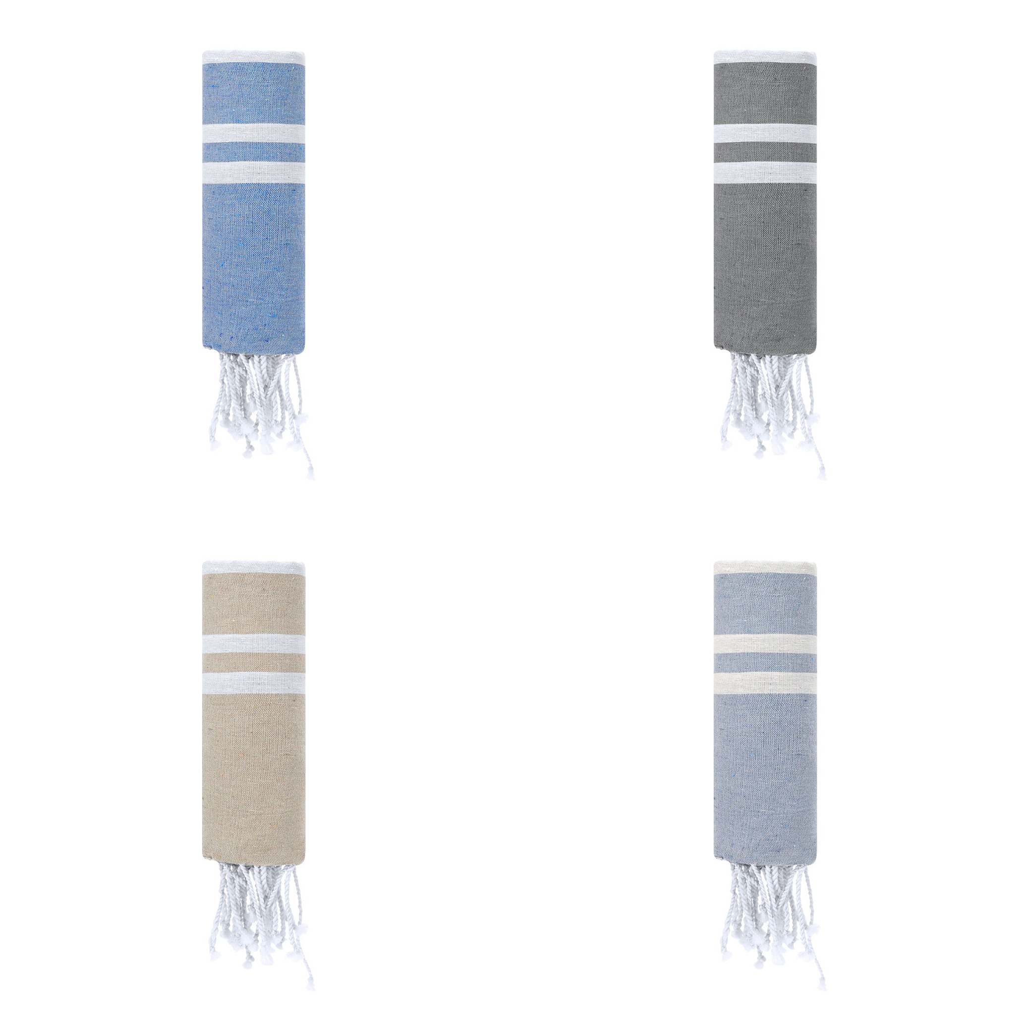 Suave pareo-toalla de 150g/m2 en combinación de algodón y poliéster. Su diseño cuenta con una base en color y rayas blancas, .Incluye flecos en los extremos que añaden un detalle decorativo y que completan su acabado.