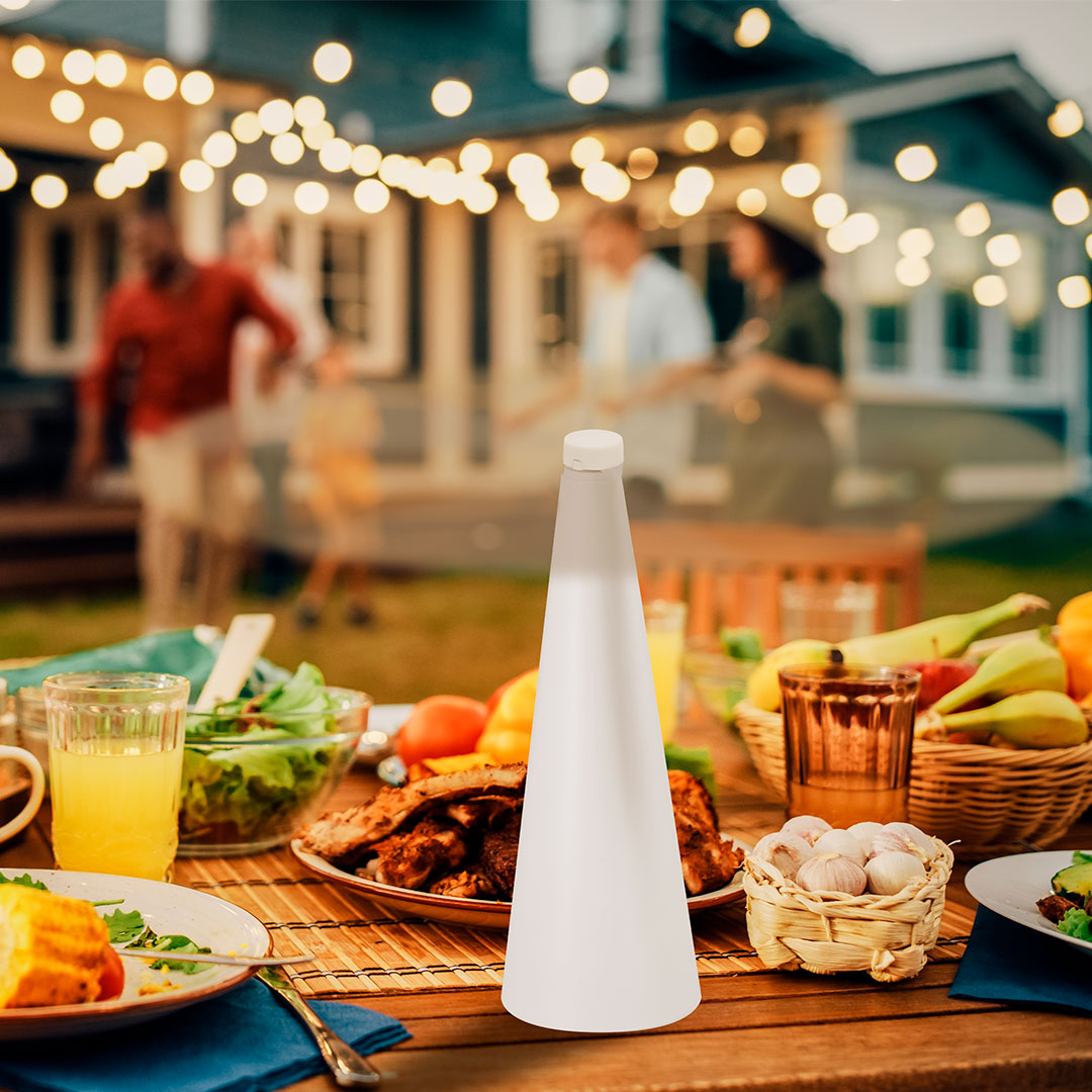 Su base cónica garantiza estabilidad en cualquier superficie. Con botón de encendido/apagado. Totalmente portátil. Ideal para emplear en interiores o al aire libre. Funciona con 2 pilas AA (no incluidas).